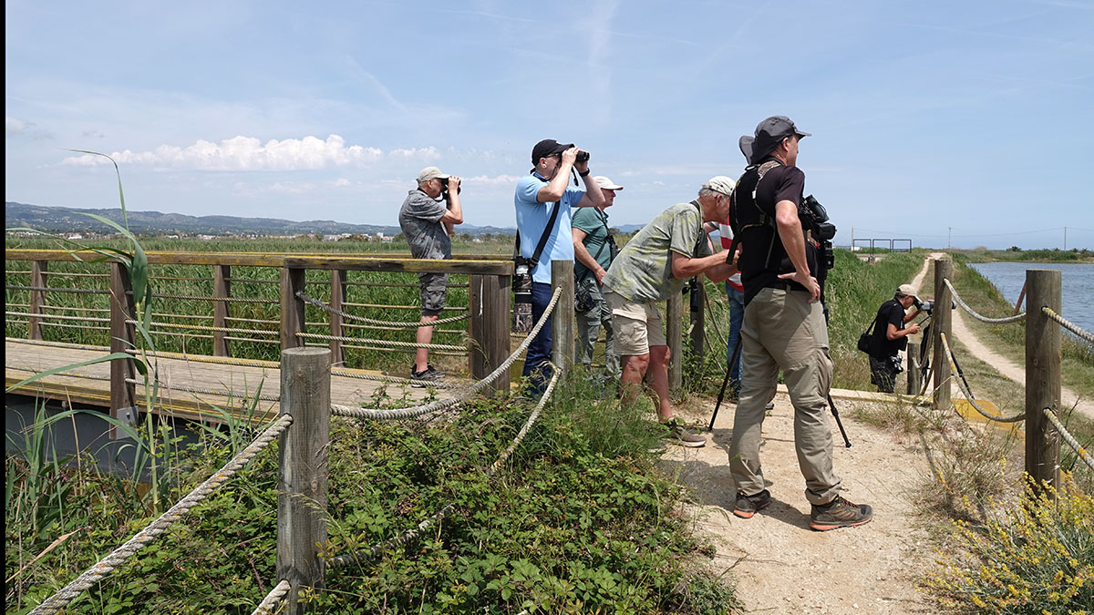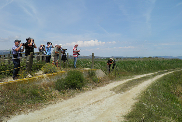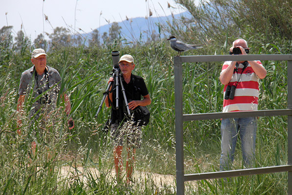 We komen even na het middaguur aan bij de Ebro Delta. Een prachtig moerasgebied met daarnaast veel rijstteelt. Als we het gebied inrijden is het meteen raak, naast een koereiger - een hop die wij missen - en meerdere steltkluten vallen 2 sterns op, die we met hun dikke zwarte snavel kunnen determineren als lachsterns, een derde stern met zwarte onderdelen blijkt, na enige twijfel van mijn kant, onmiskenbaar een witwangstern. Een pjietende graszanger, een verre bruine kiekendief, een purperreiger, grote en kleine zilverreiger en een waterhoen worden aan de lijst toegevoegd. Een overvliegende zwarte ibis is pas een van de vele die we gaan zien. |