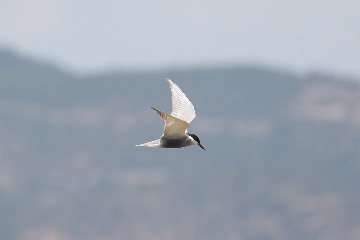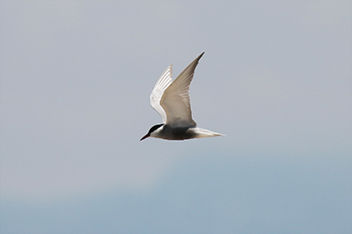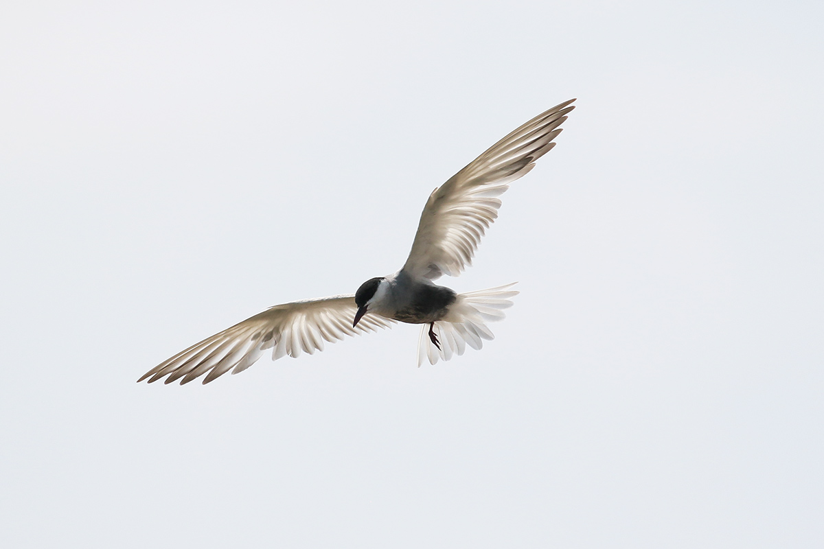 De witwangstern lijkt doorschijnende vleugels te hebben.