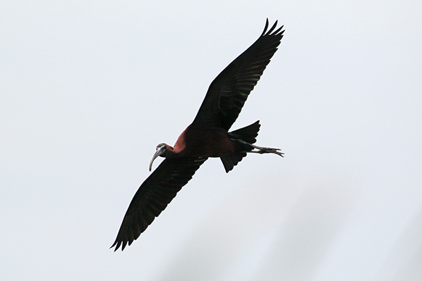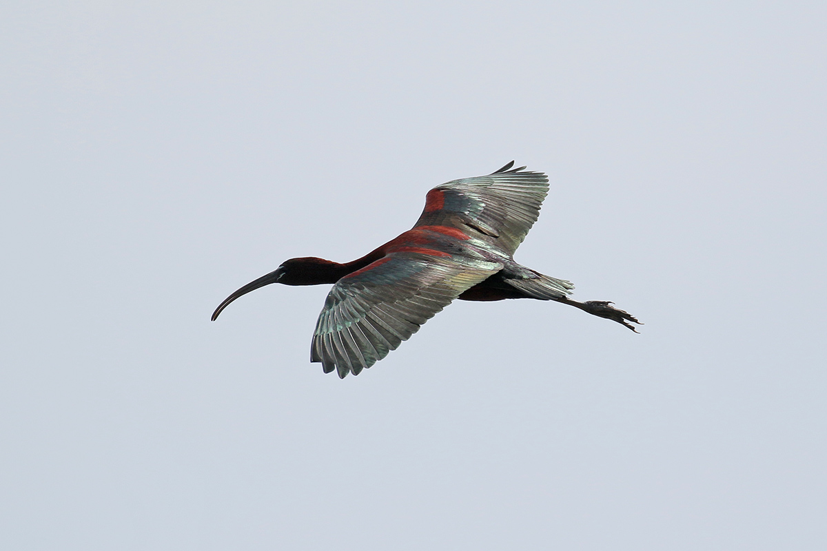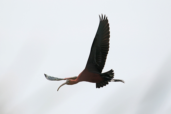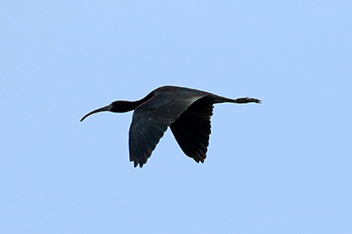 Ik slaag erin een paar zwarte ibissen te fotograferen. Altijd lastig die donkere beesten en de bovenste twee vliegen laag waardoor ik de rietstengels als zwarte vegen op de foto's terugzie. De onderste zwarte ibis werkt beter mee en vliegt geheel vrij voor me langs waarbij ik de glanzend groene vleugels goed zie. Goed te begrijpen ook waarom de zwarte ibis in het Engels Glossy Ibis heet. |