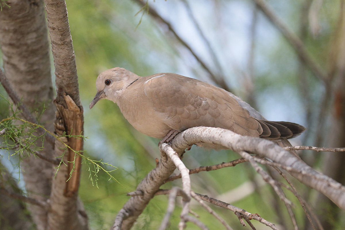 Vlakbij de auto zien we een jonge Turkse tortel. Die heeft nog niet geleerd dat mensen een bedreiging kunnen zijn, want het beestje blijft stoïcijns zitten. Vanuit de auto zie ik even later ook nog kans om een mooie kleine zilverreiger te fotograferen. |
