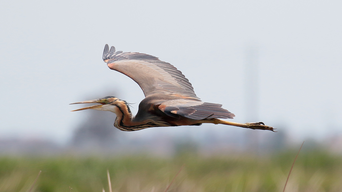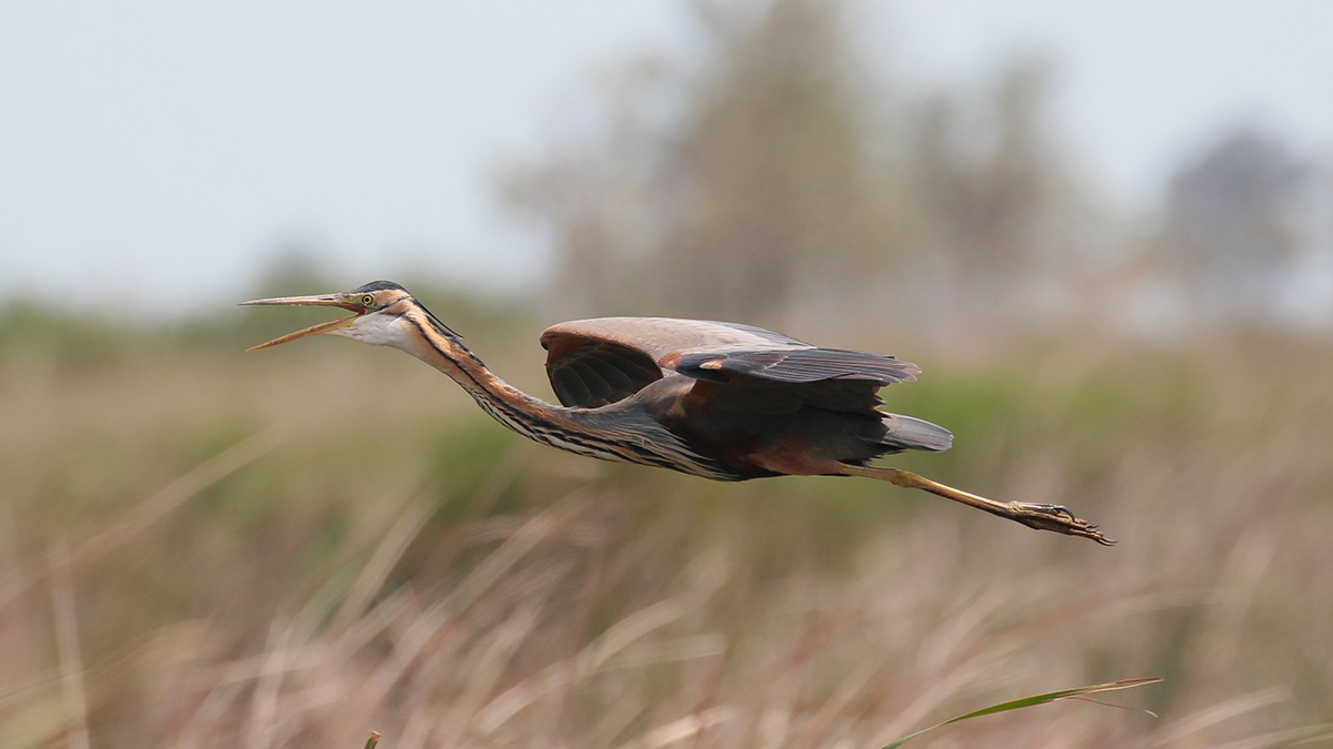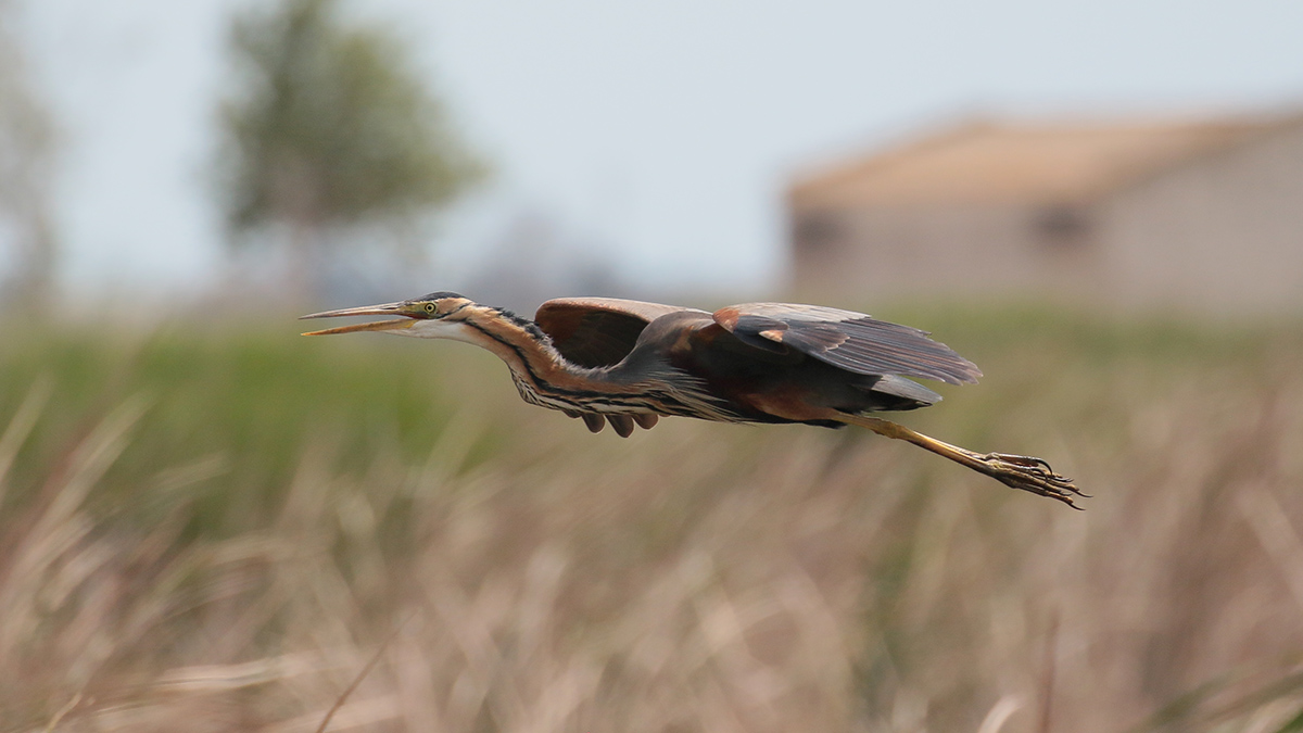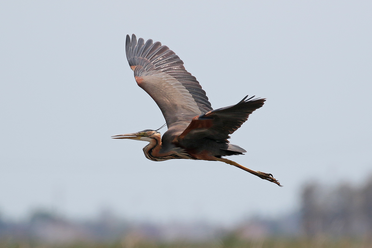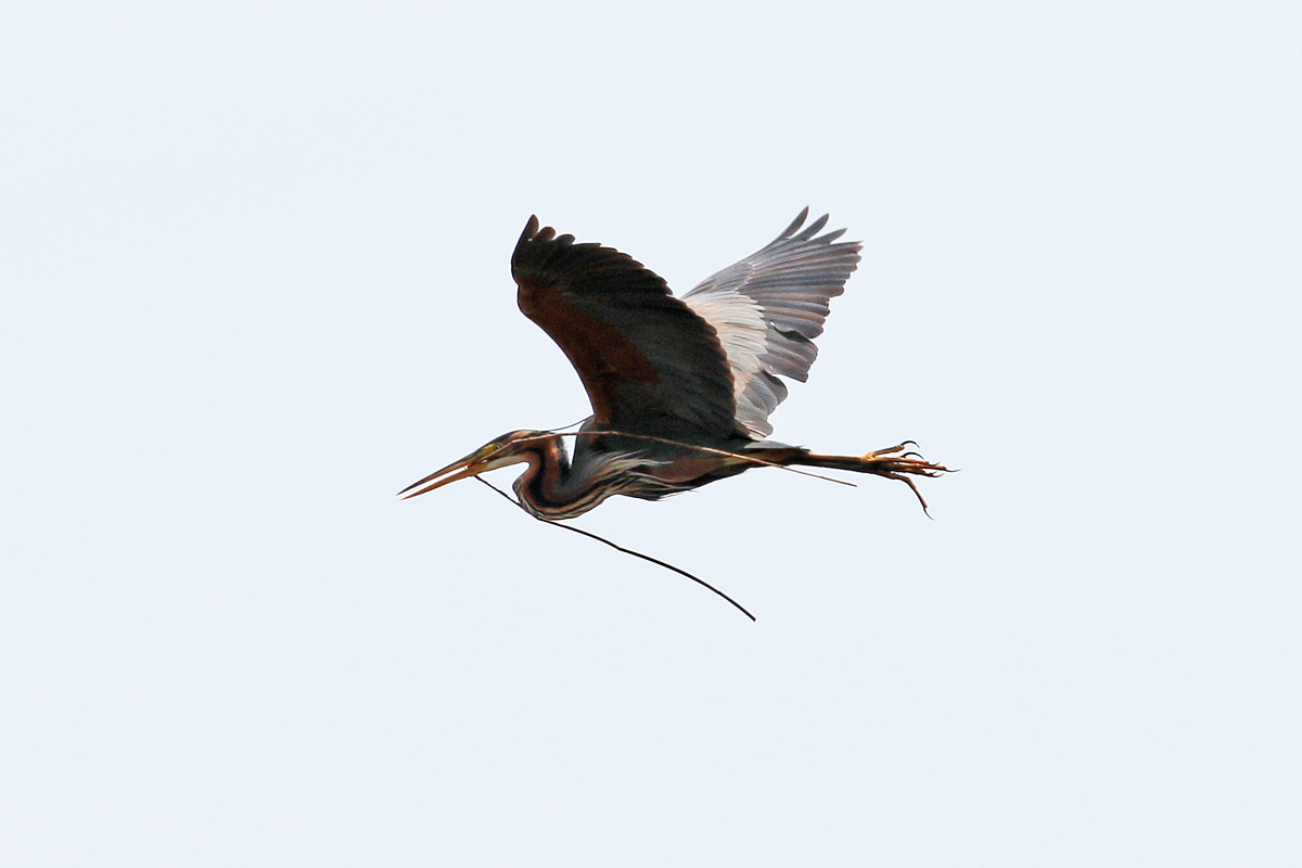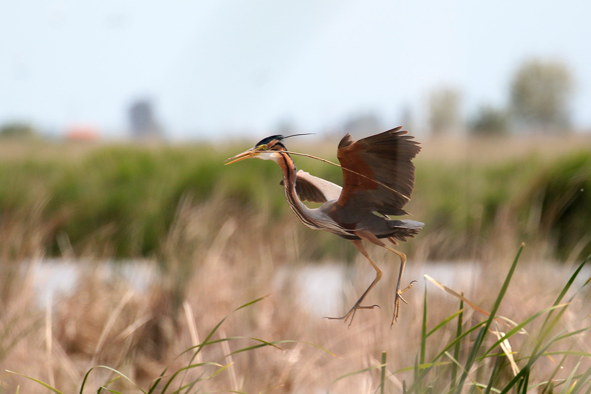 De witwangsterns flappen op afstand over het moeras, maar een purperreiger geeft een vliegshow vlak voor mijn camera. Ik maak er dankbaar gebruik van en schiet wat plaatjes van dichtbij. Dat lukte me nog niet in Nederland. Als we na veel genieten weer vertrekken zie ik een ralreiger, dus die “misser” maak ik nu weer goed. |