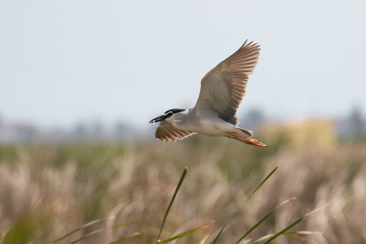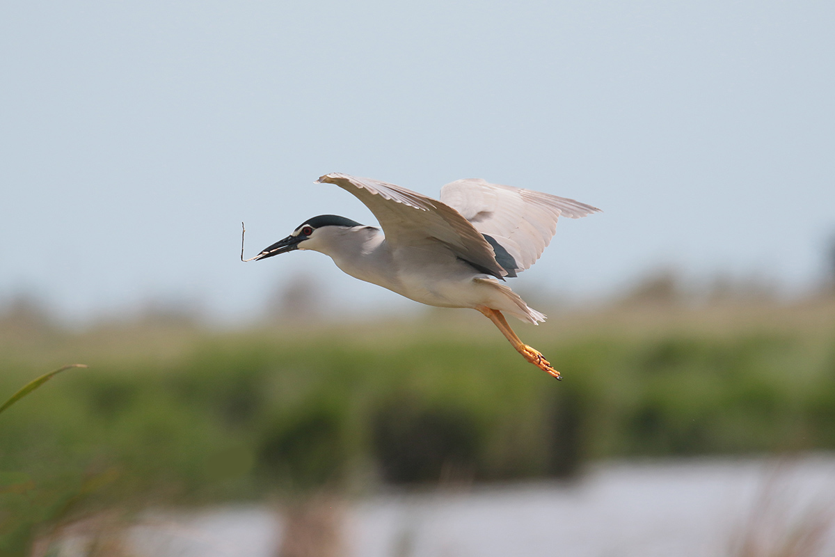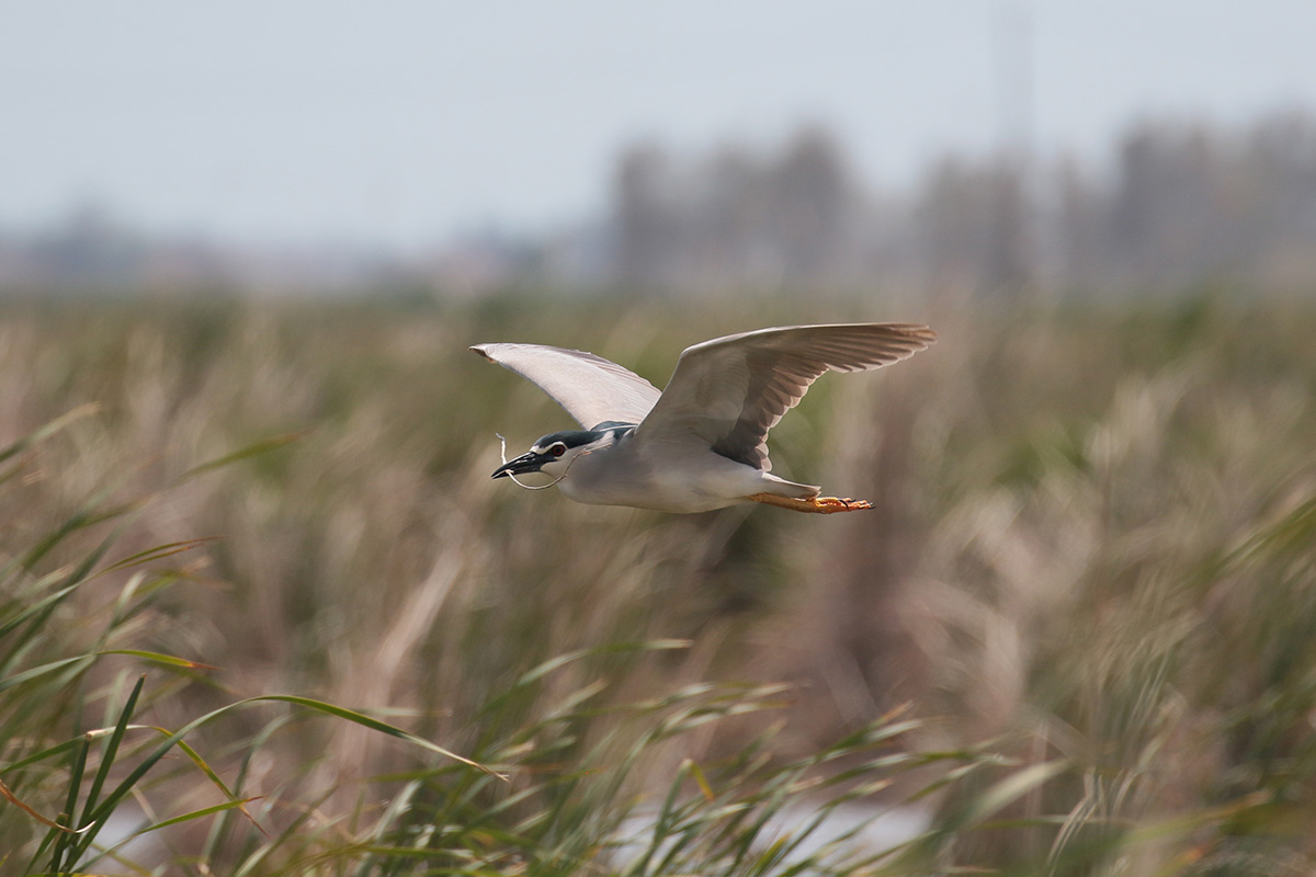 Ook een kwak is met nestmateriaal aan het slepen. In de verte ziet Sander een Audoins meeuw, een mooie soort, die we misschien niet meer gaan zien. |