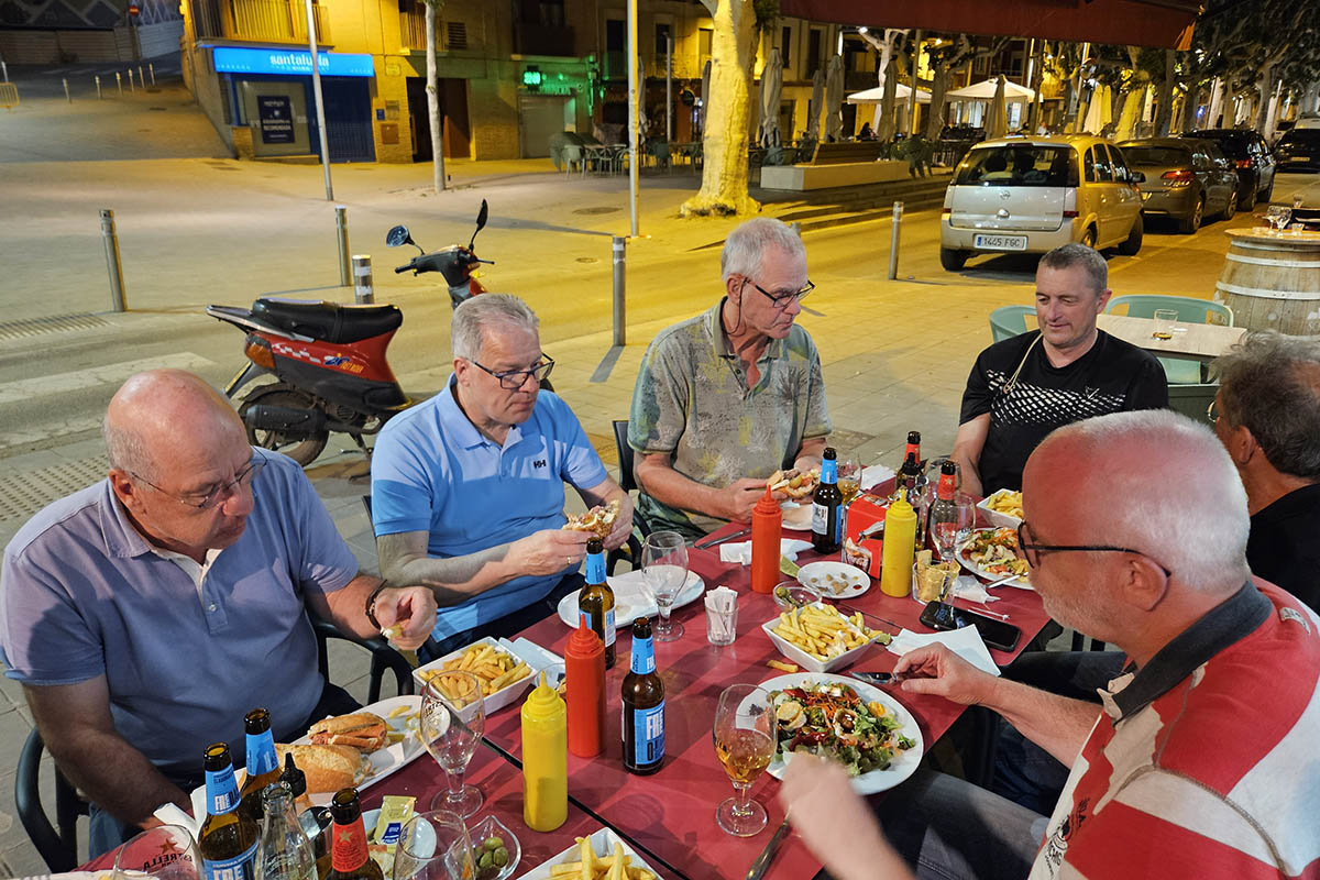 Gelukkig weet ik iedereen te bewegen naar een restaurant op zoek te gaan, in plaats van de broden op te eten die de eigenaresse, heel sympathiek, voor ons heeft klaargelegd. In Salas Altas en Salas Bajas blijkt er niets open te zijn, maar in Barbastro, 10 kilometer verderop vinden we uiteindelijk een prima restaurantje waar we buiten gezellig eten. Om 23:30 zijn we pas thuis. Ik app nog even gezellig met Gina, maak een begin met dit verslag, lees nog een hoofdstuk van mijn eBook en om kwart over twaalf komt er een einde aan een lange, maar erg leuke dag . |
